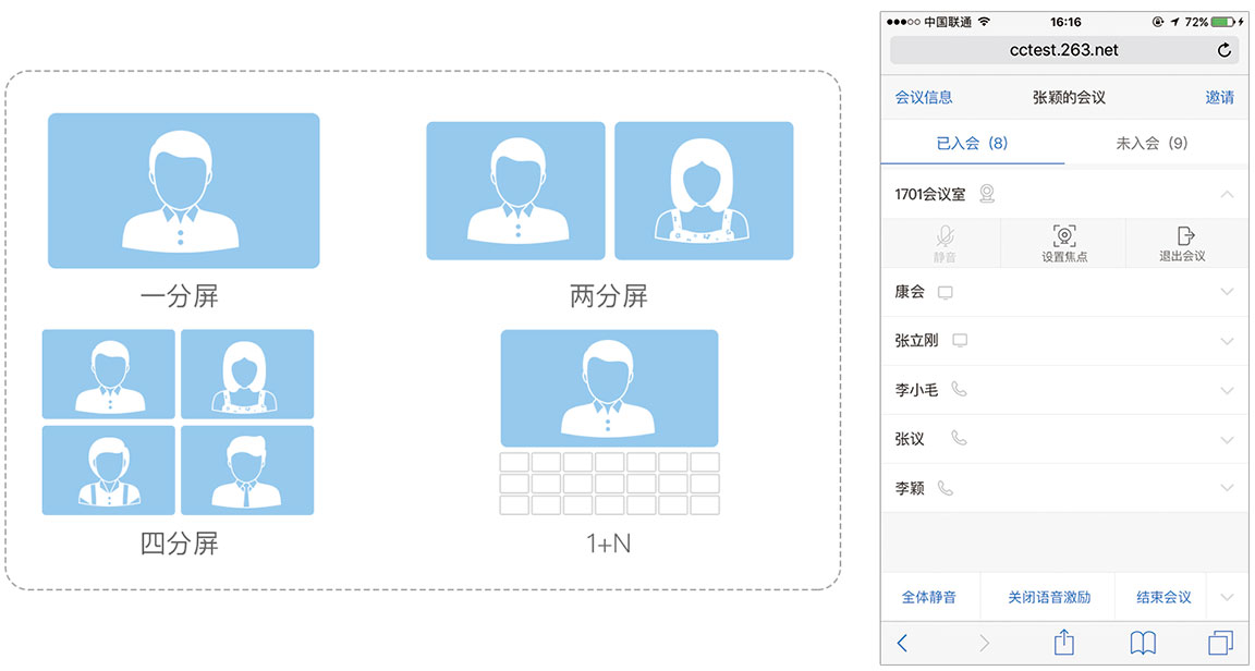 使用SIP、H323協(xié)議支持主流硬件設(shè)備;PC和手機(jī)也能入會(huì)。
